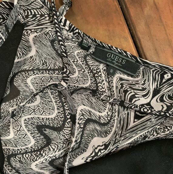Tela fresca delgada y elegante. Tela que cae, detalle al frente y tela cruzada en la espalda. Estampada color negro palo rosa.