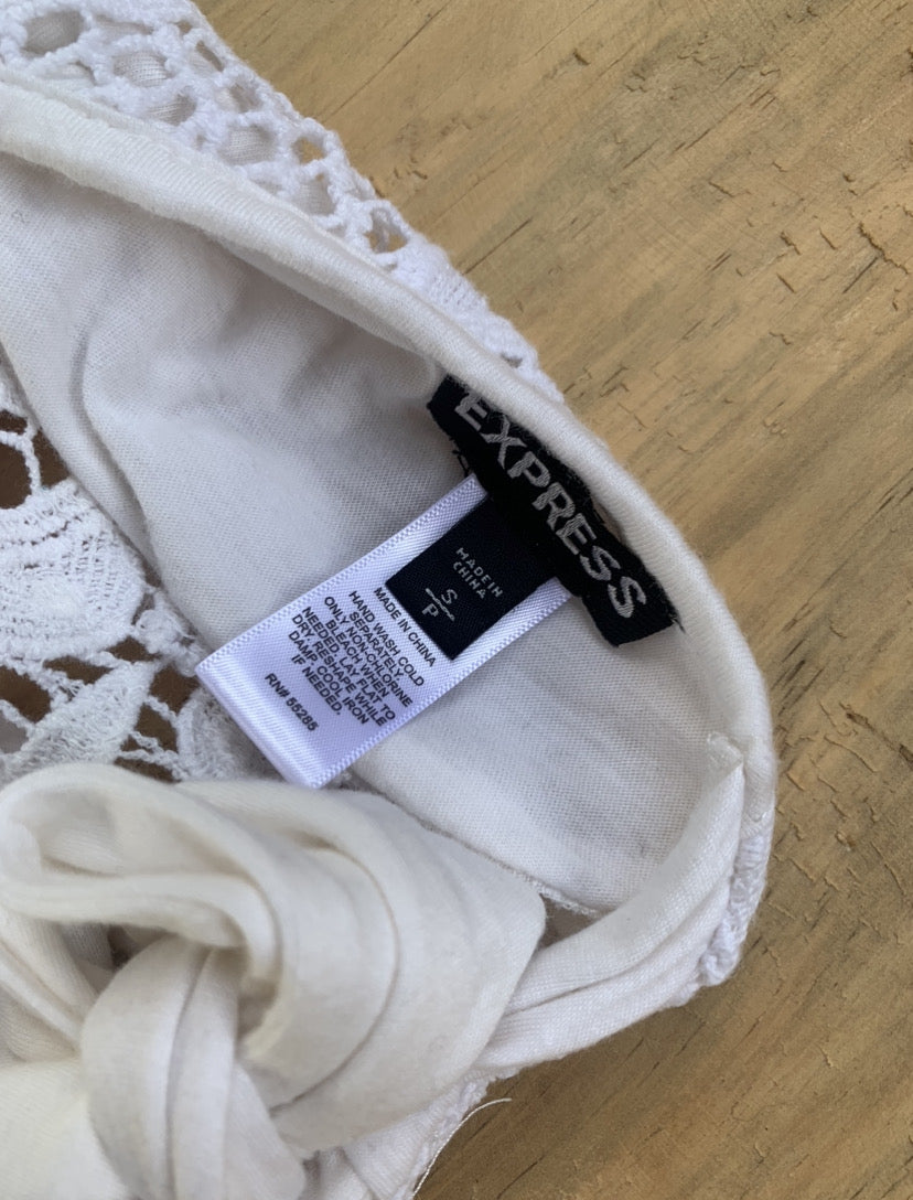 Blanca, tejida con forro. Se amarra en espalda. Tirantes ajustables.