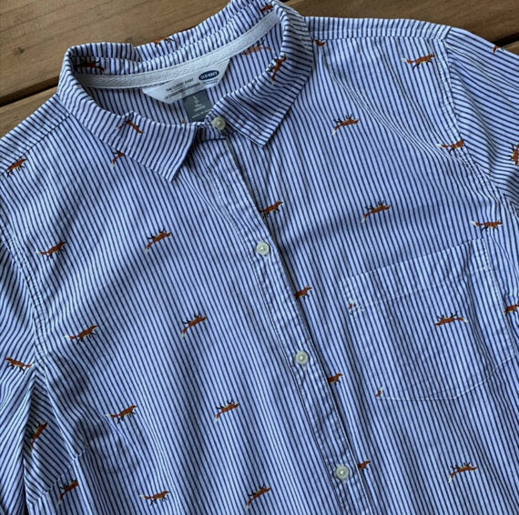 Tela suave y fresca, lineas y zorro, color azul y blanco.