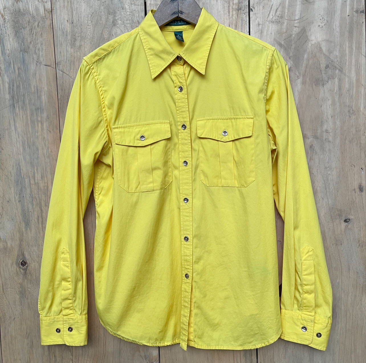 Amarilla, tela fresca y elegante con botones y bolsas. Nueva