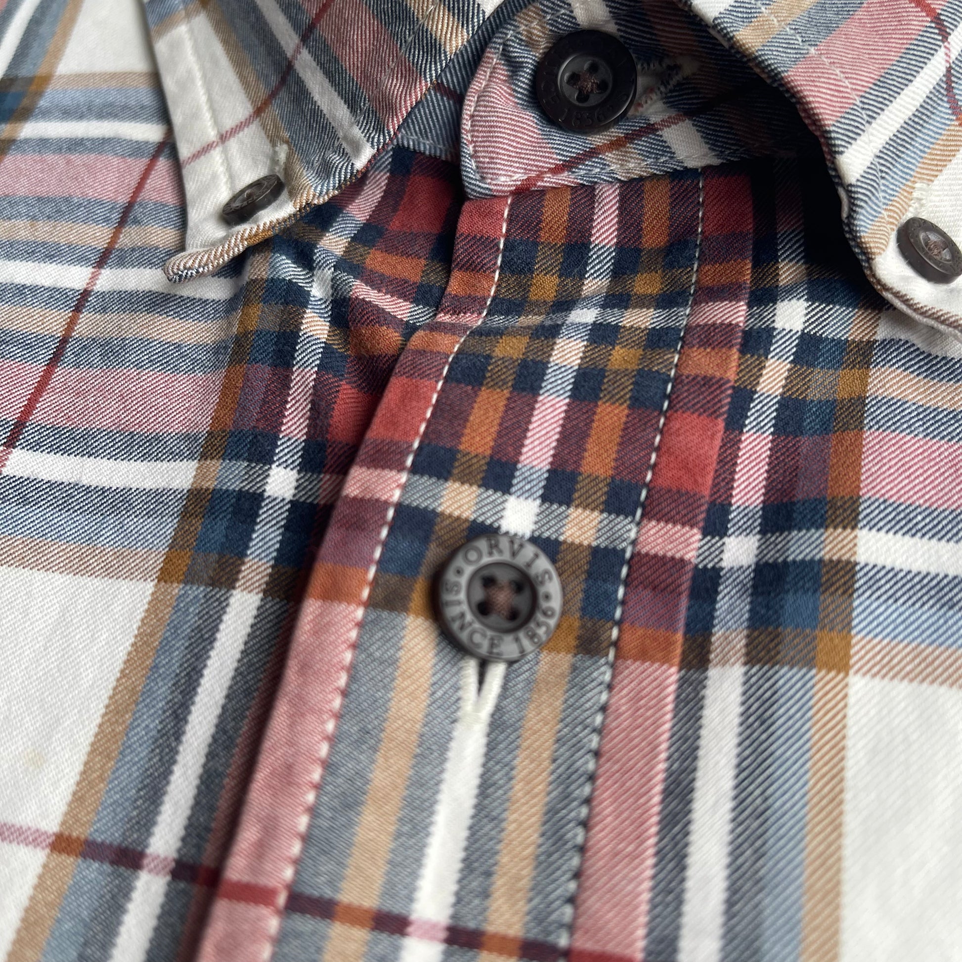 Camisa de tela elegante y un poco gruesa, fresca y con tonos beige, terracota, mostaza, café y un toque de azul. Con botones muy elegantes y bolsa al frente. Nueva sin etiqueta. Medidas aproximadas: Espalda: 54 cm | Pecho: 60 cm | Largo: 78 cm | Manga: 60 cm