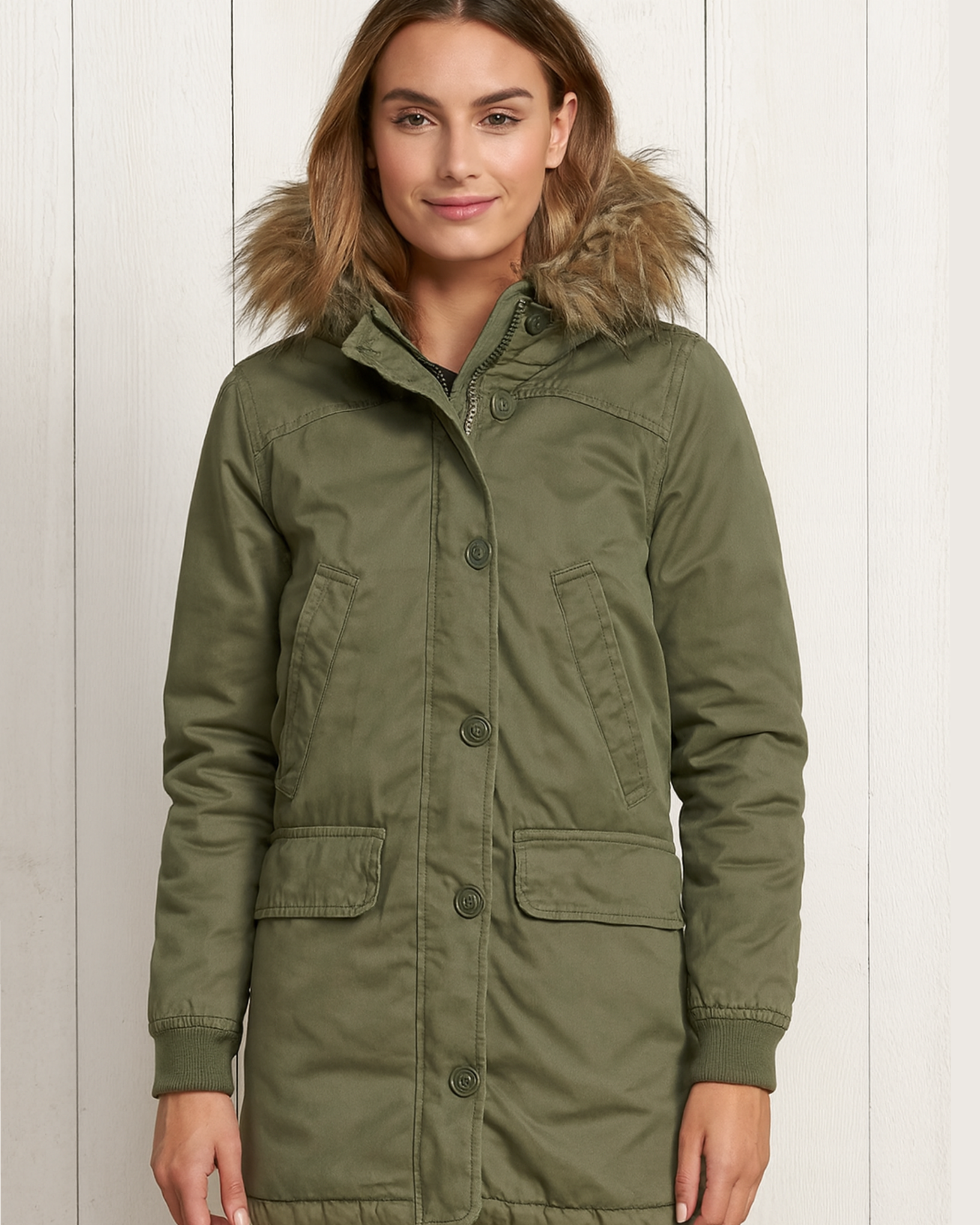 Verde olivo, diseño militar. Forro naranja elegante, calientita. Con botones, zipper y capucha con peluche removible. Larga. Nueva. Medidas: Espalda 45, Ancho 50, Largo 85, Manga 66