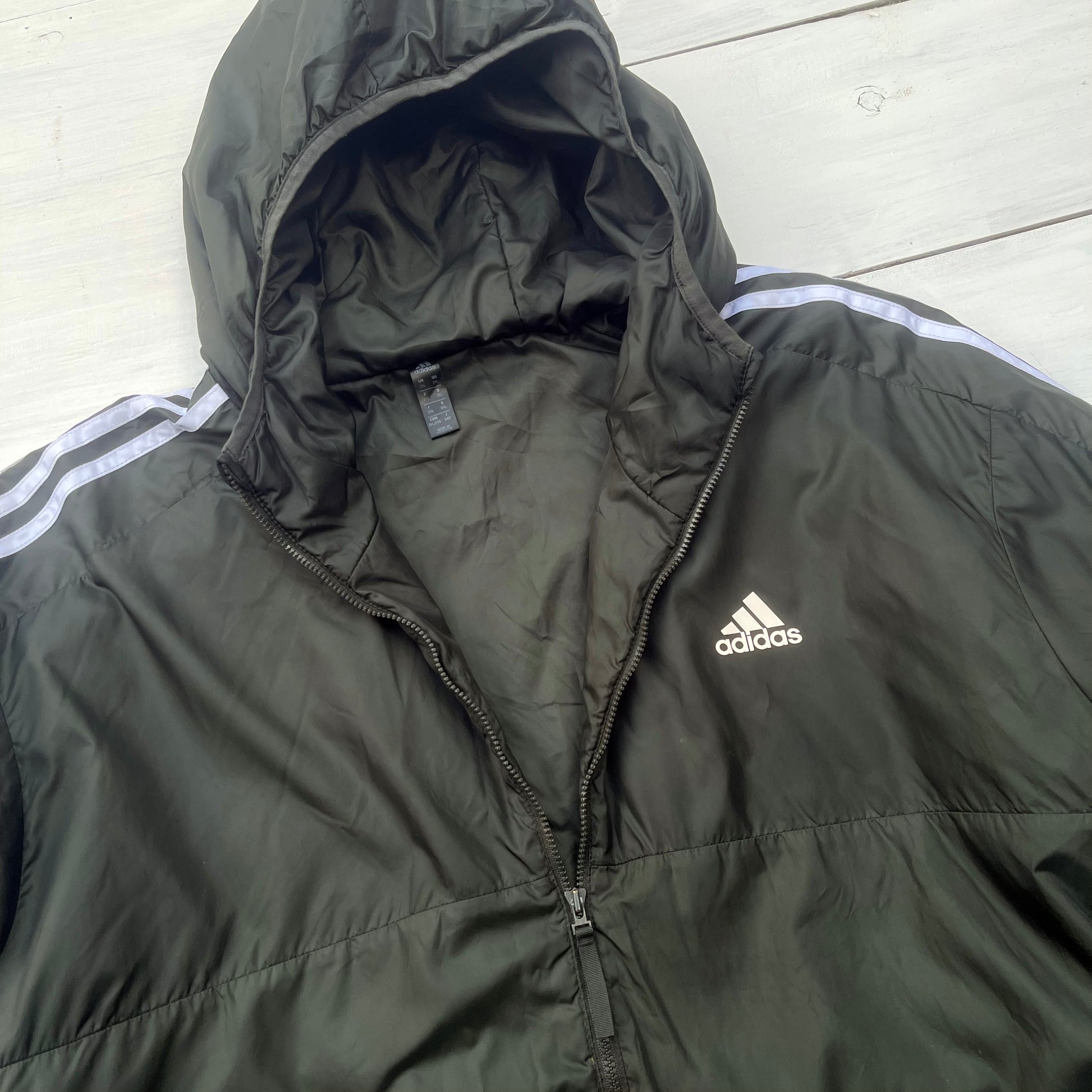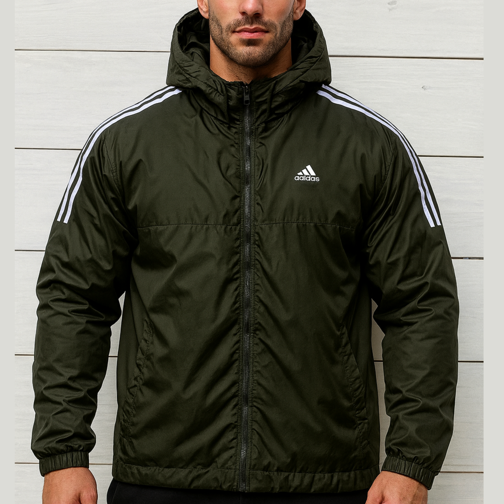 Verde olivo, diseño elegante y deportivo. Con forro interior, abrigadora. Presenta el diseño clásico de rayas blancas en las mangas y cuenta con capucha, dos bolsas y cierre frontal. Nueva, sin etiqueta.