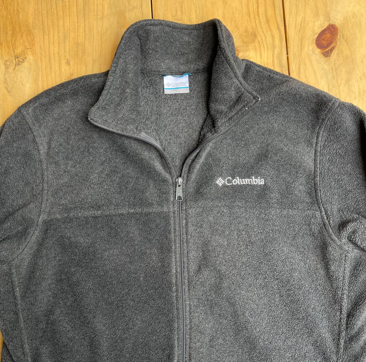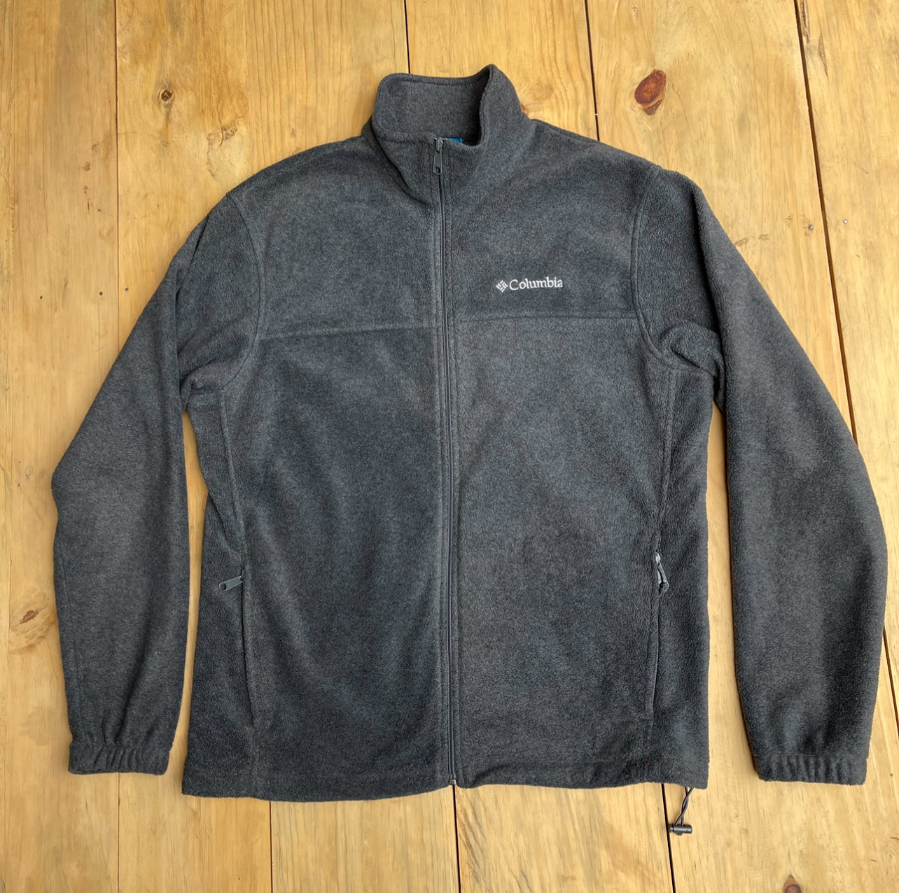 Gris oscuro, tela suave y calientita. Con zipper y bolsas. Logo al frente.