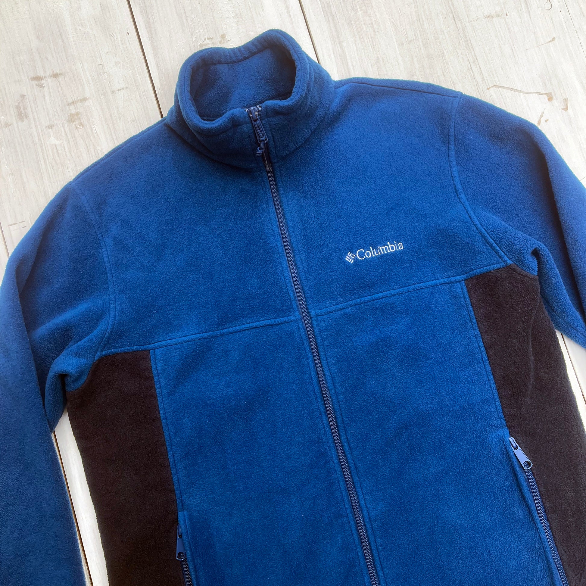 Azul con gris, tela suavecita y calientita de material fleece, con zipper y bolsas. Logo de la marca al frente. De segunda mano, en perfecto estado.