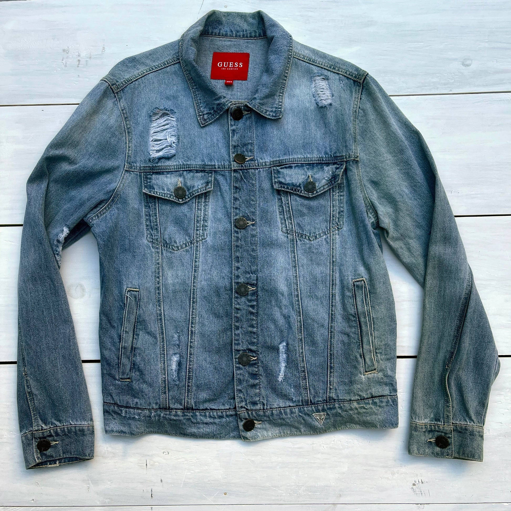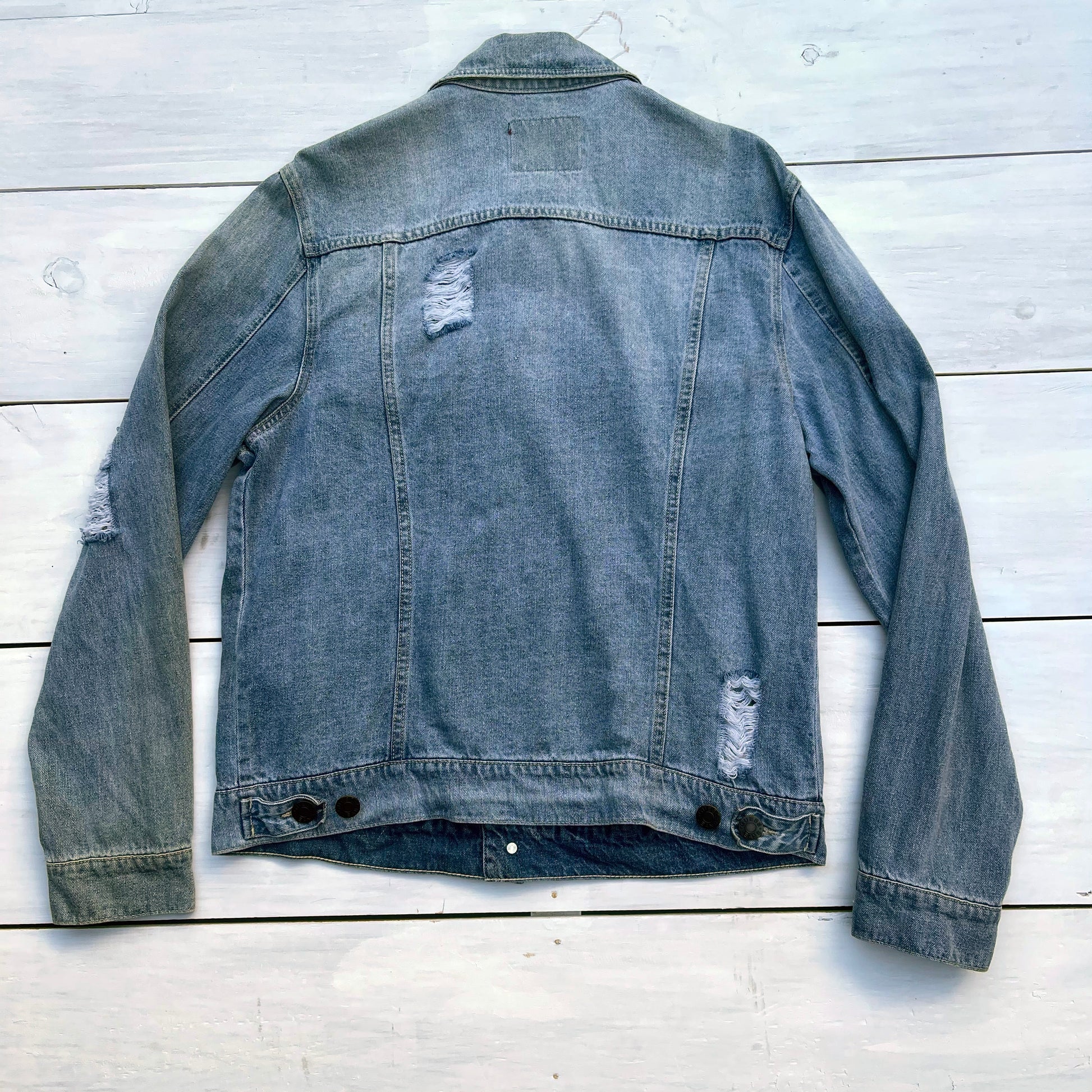 Celeste claro, tela de lona ligera, estilo clásico con detalles de desgaste al frente, en mangas y espalda. Cuenta con broches, 4 bolsas exteriores y 2 bolsas interiores. Nueva, sin etiqueta.