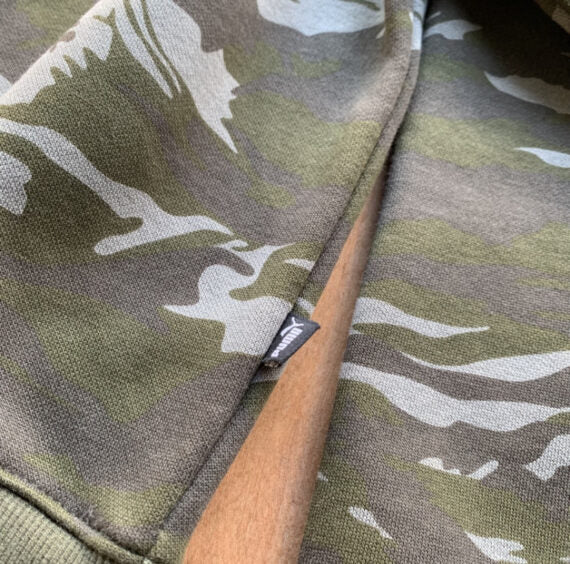 Verde estampado militar, con capucha, tela suave y calientita.