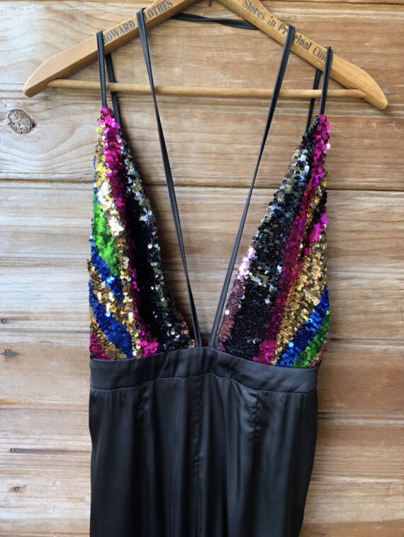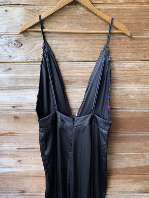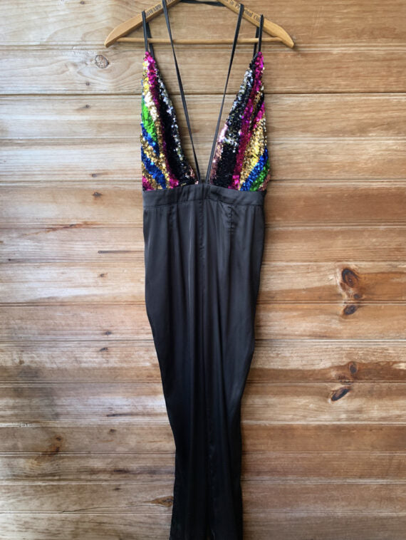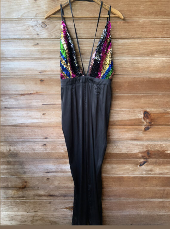Tela cómoda y fresca, color negro con lentejuelas de colores brillantes. Escote, espalda destapada y pantalón. Medidas: Cintura 35, Largo 142.