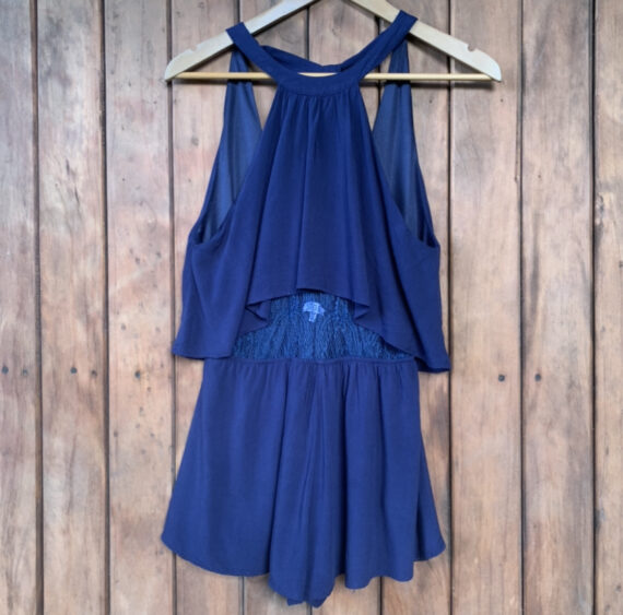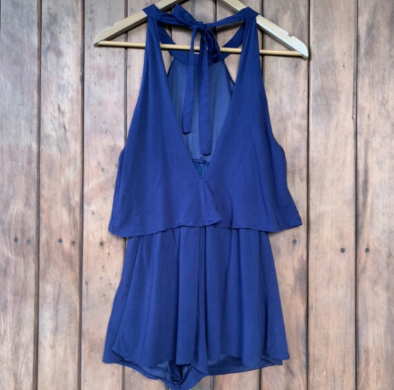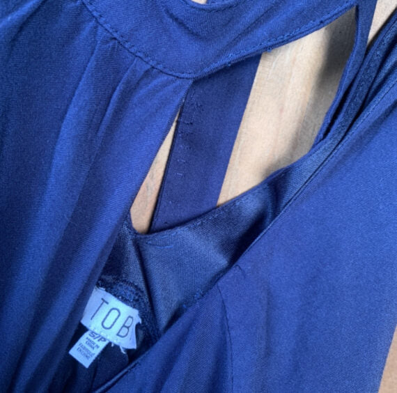 Tela cómoda y fresca, color azul, detalle en cintura y escote en espalda. Medidas: Ancho 42, Cintura 31, Largo 66.