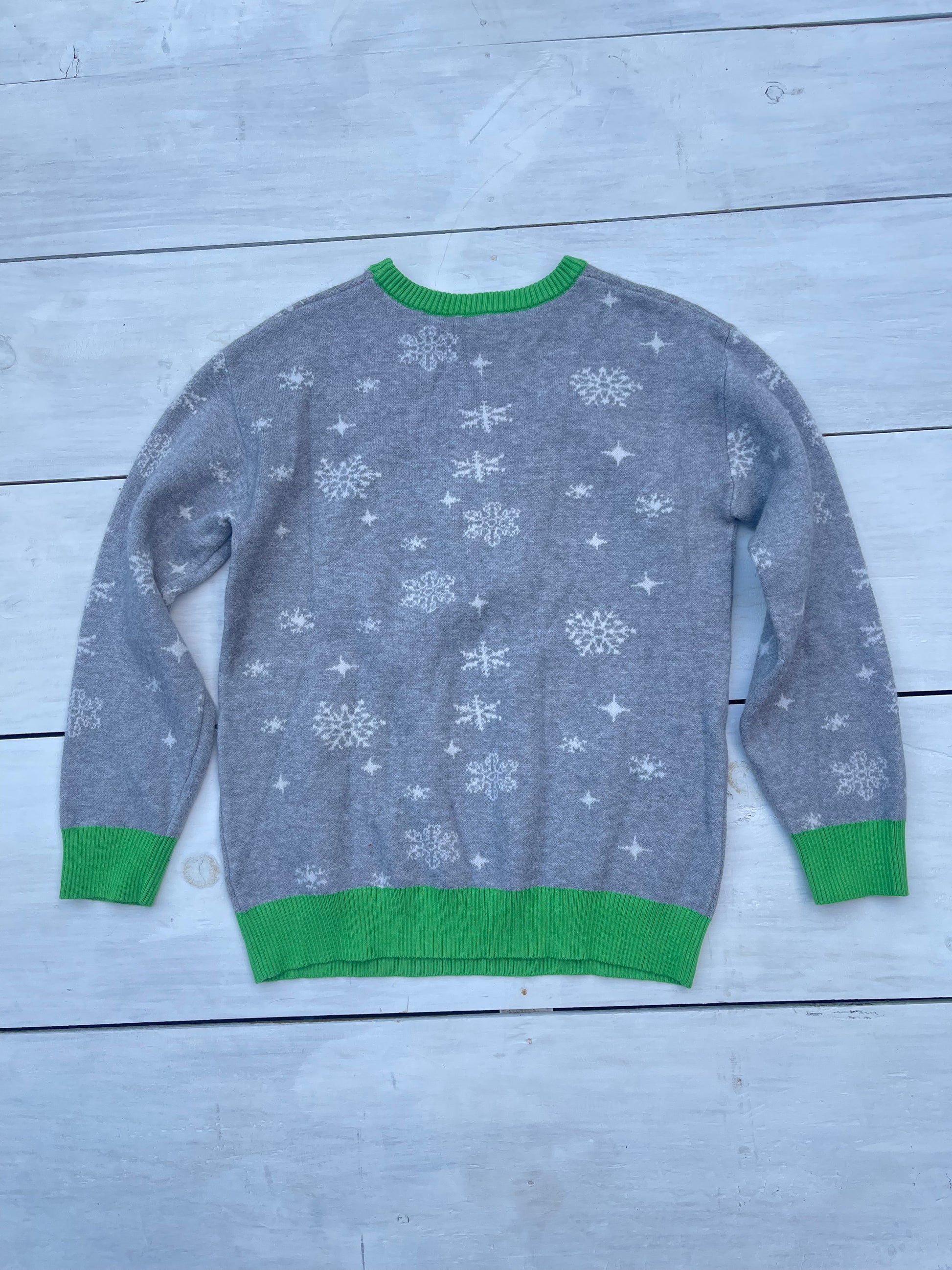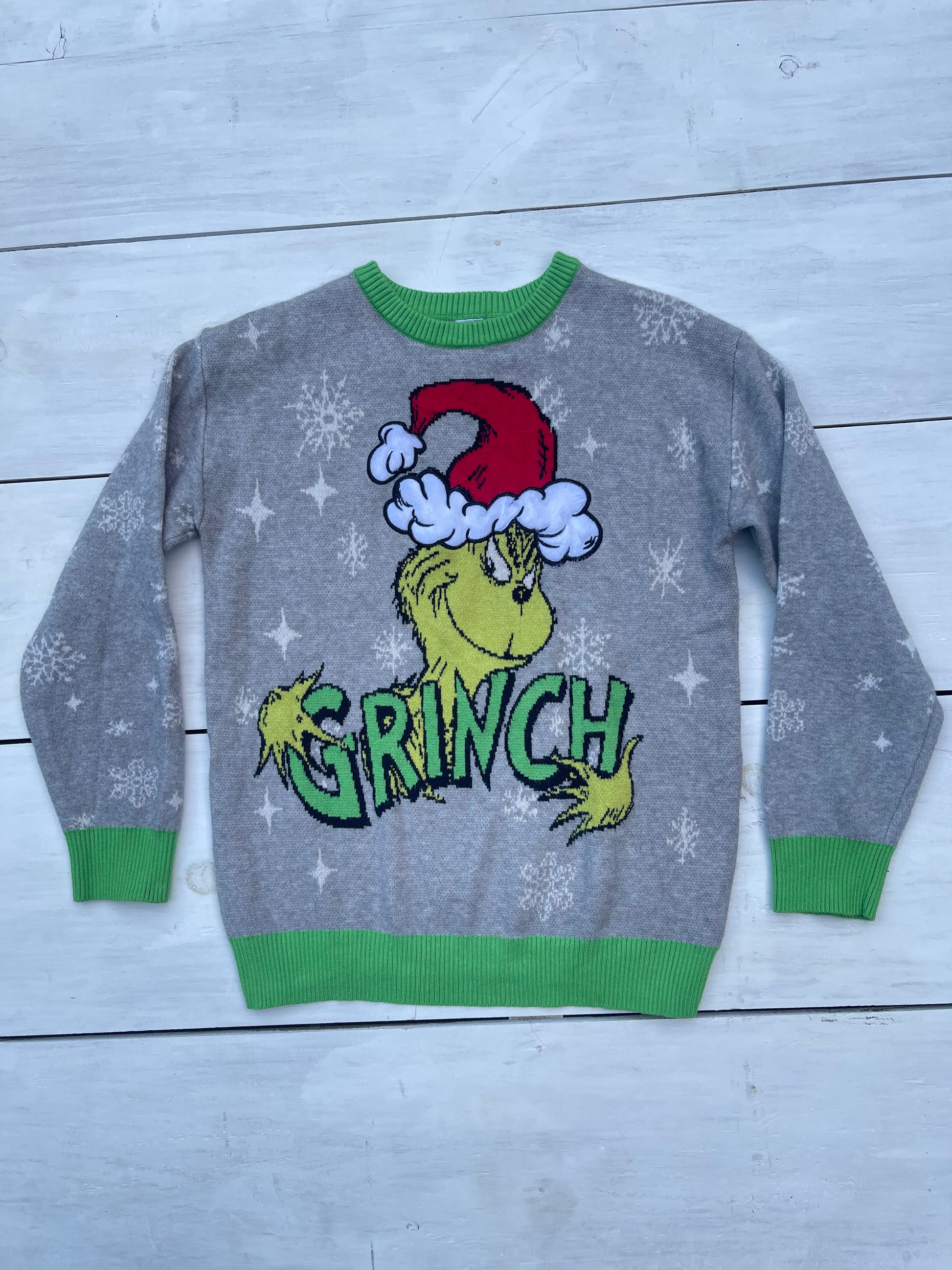 Gris, estampado navideño del Grinch, con mangas y cuello verde. Muy calientito y elegante. Nuevo sin etiqueta.