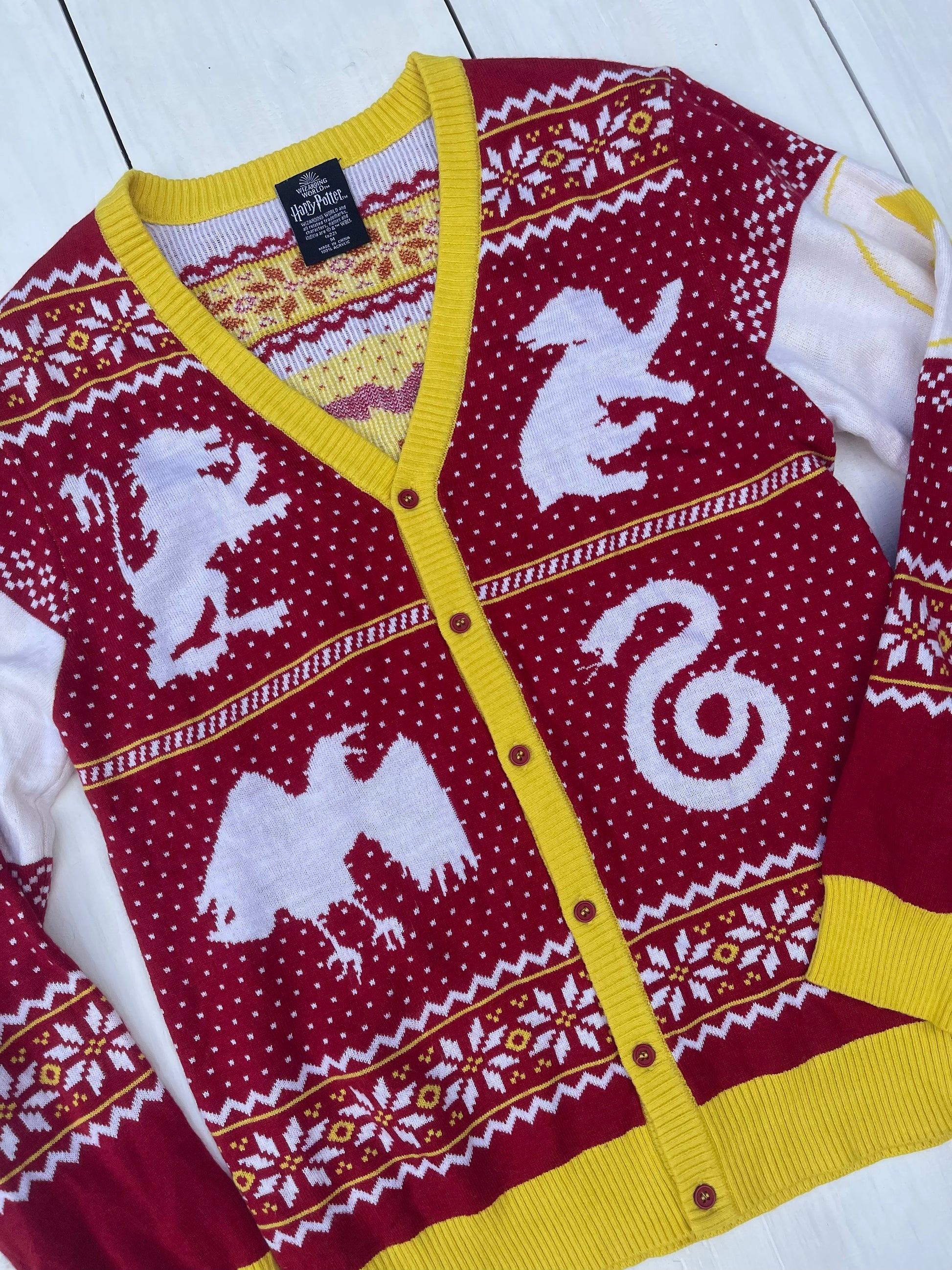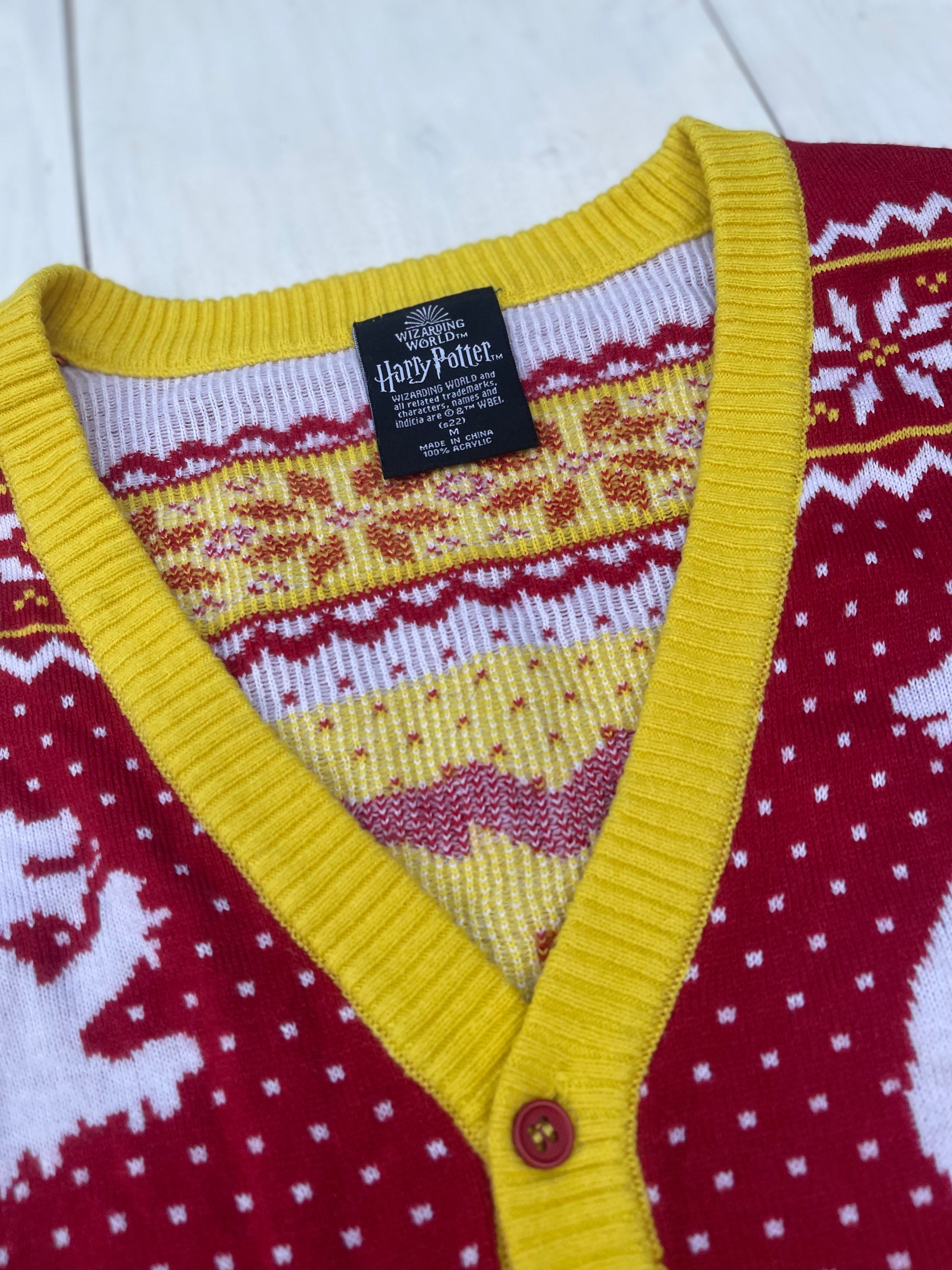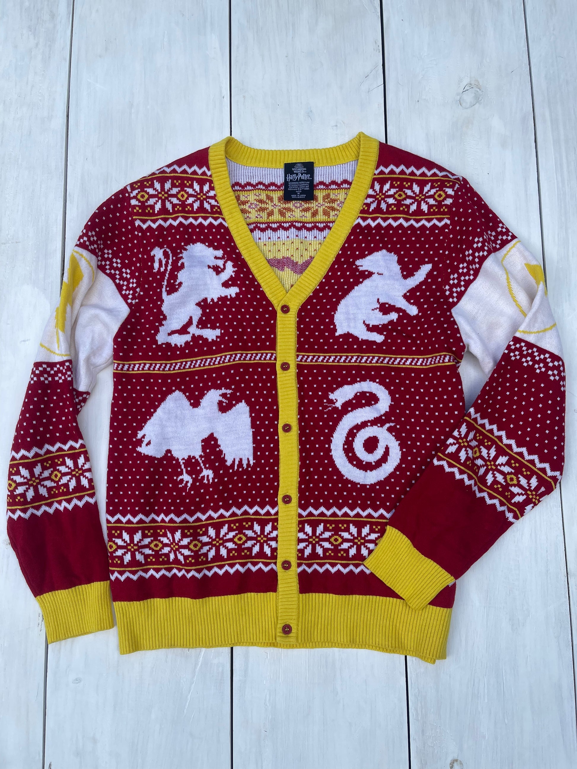 Rojo con amarillo y blanco, tejido, con diseño navideño de Hogwarts al frente, en mangas y en la espalda. Nuevo sin etiqueta.