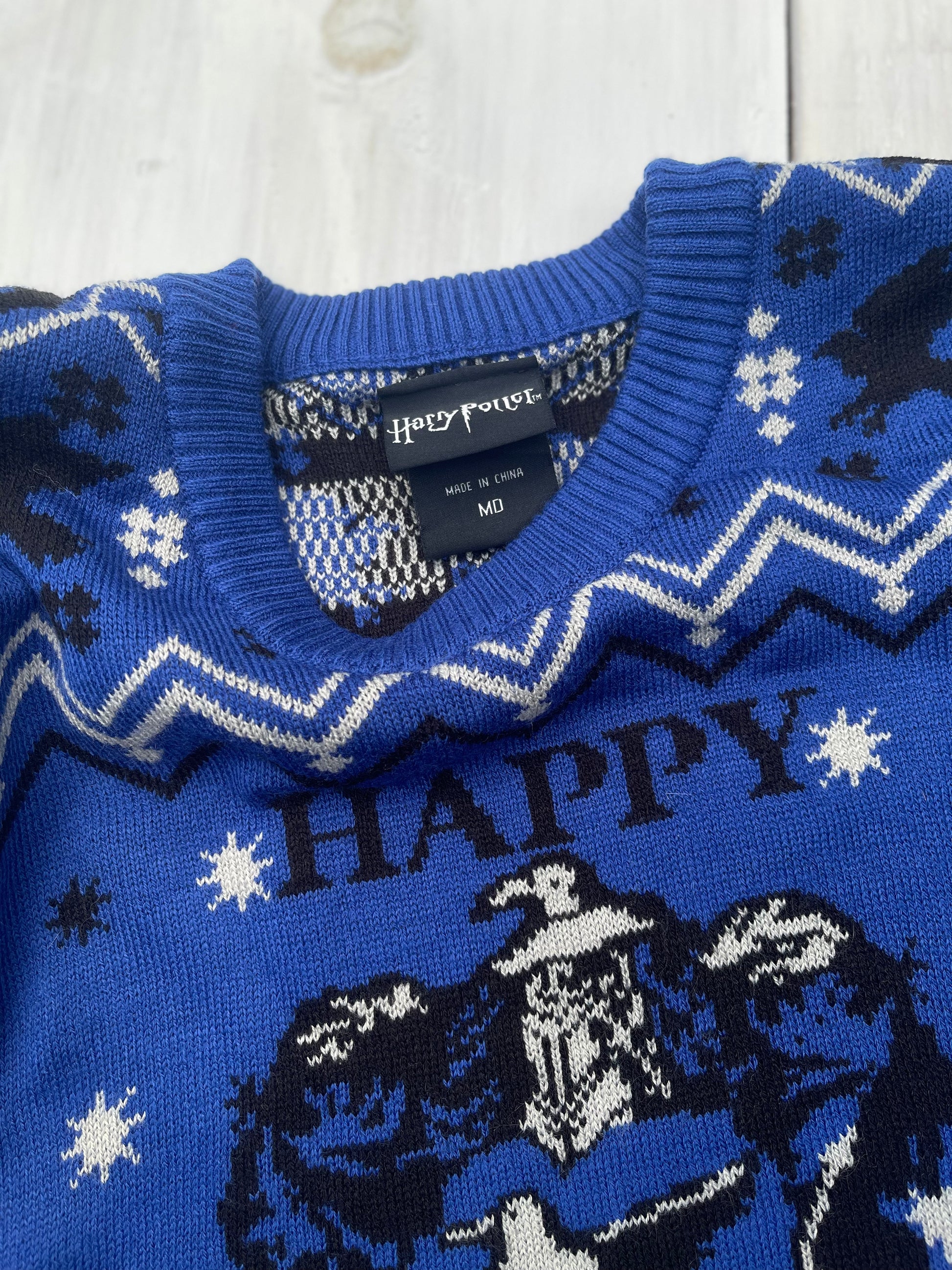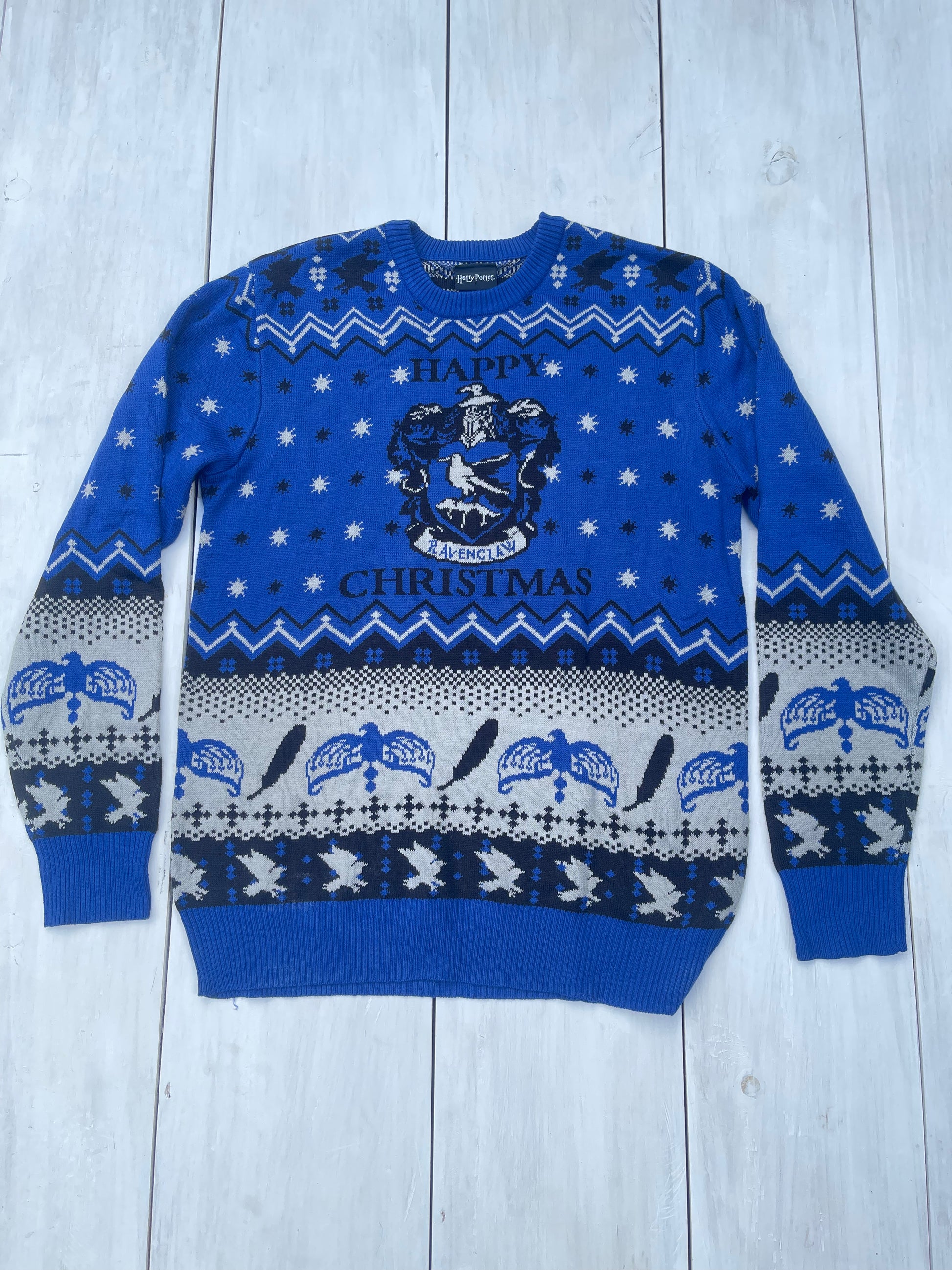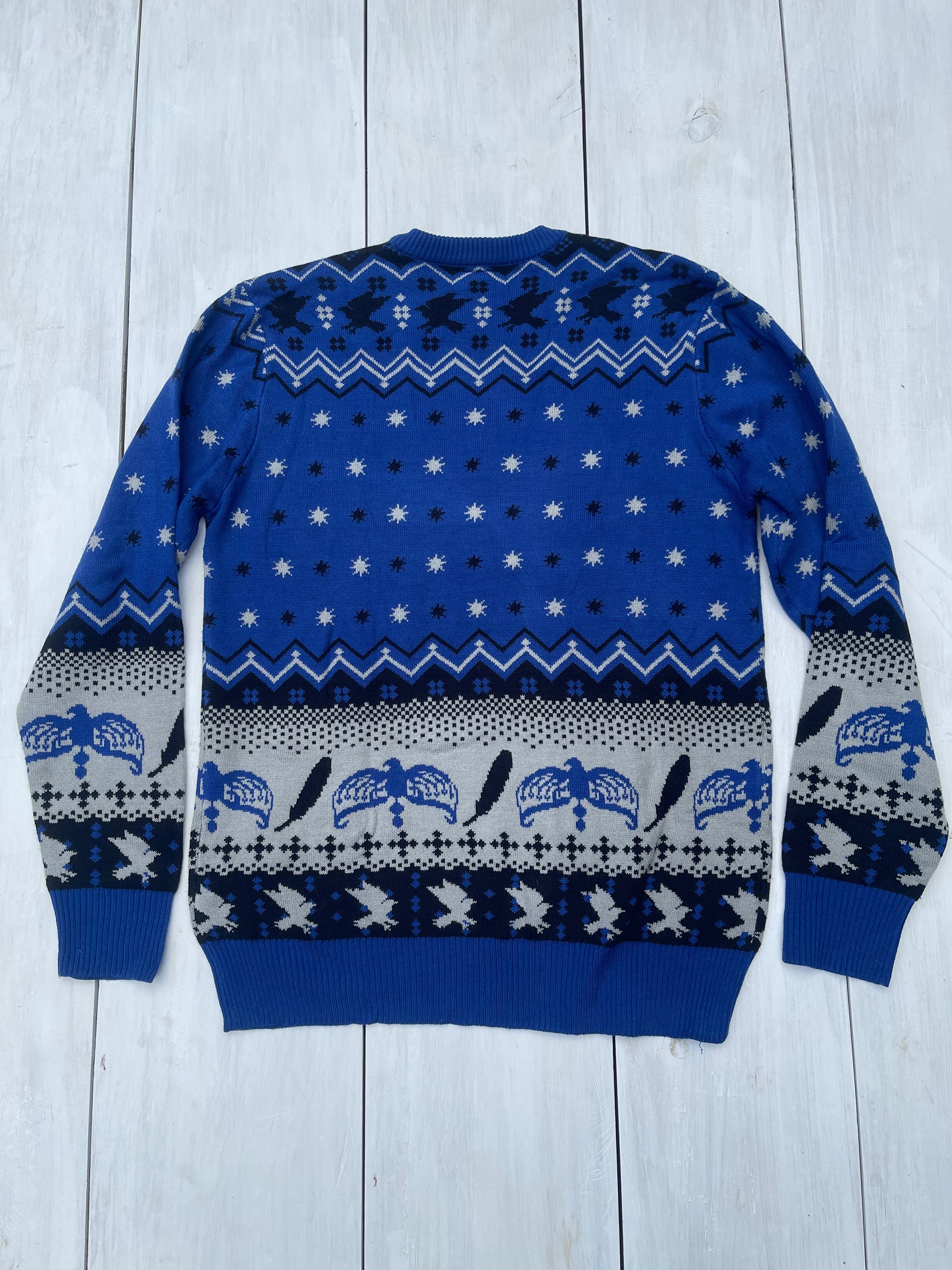 Azul, negro y gris. Tejido calientito, muy elegante. Estampado con diseños al frente, en mangas y en la espalda.