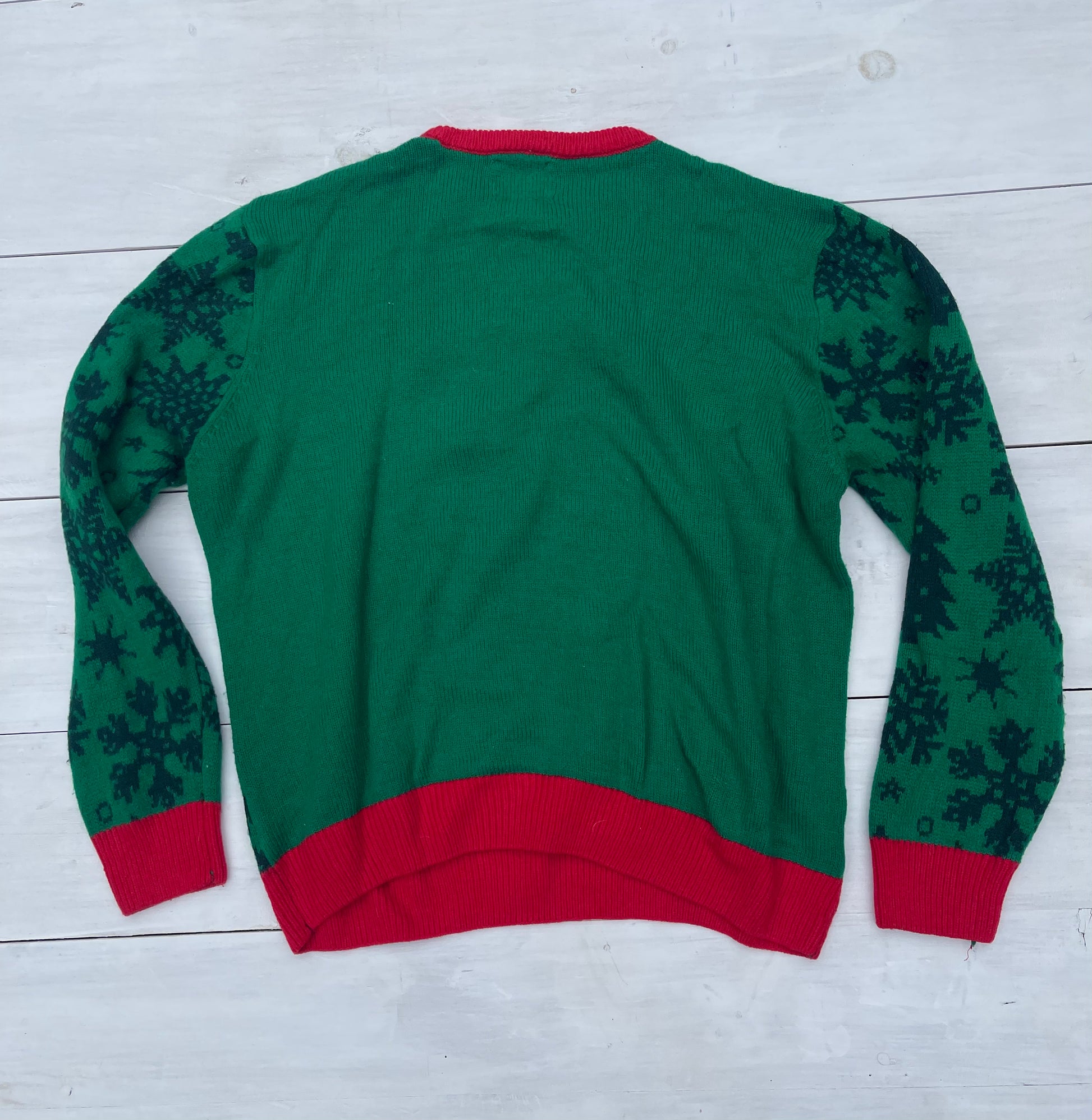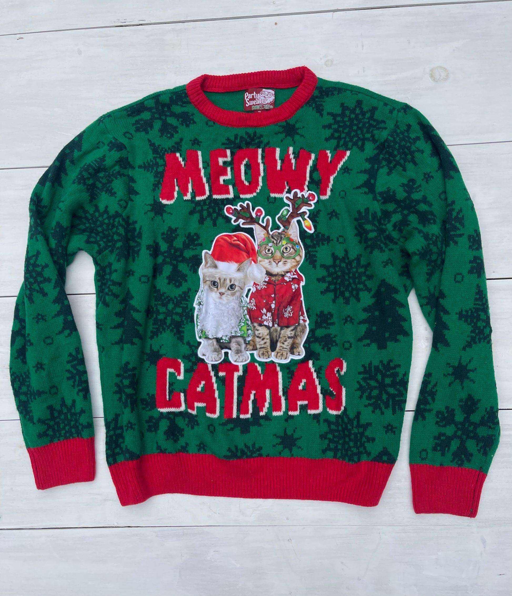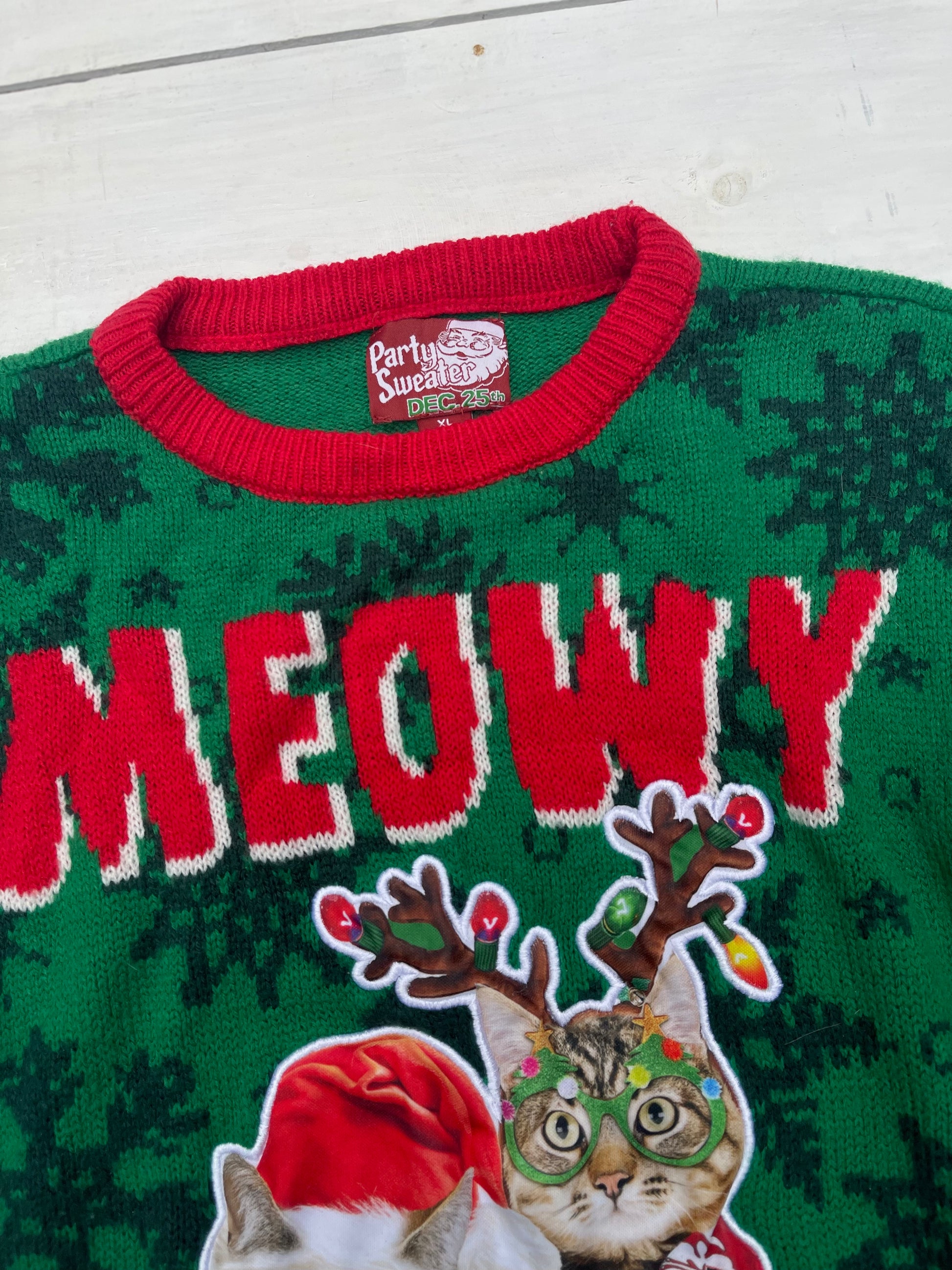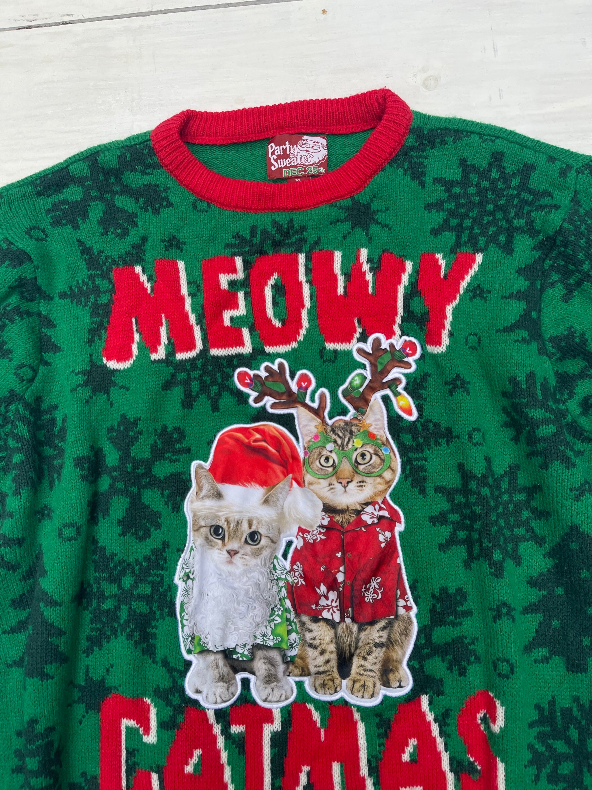 Verde tejido calientito, con diseño de gatos navideños. Suéter Meowi Cat Mask, talla XL,