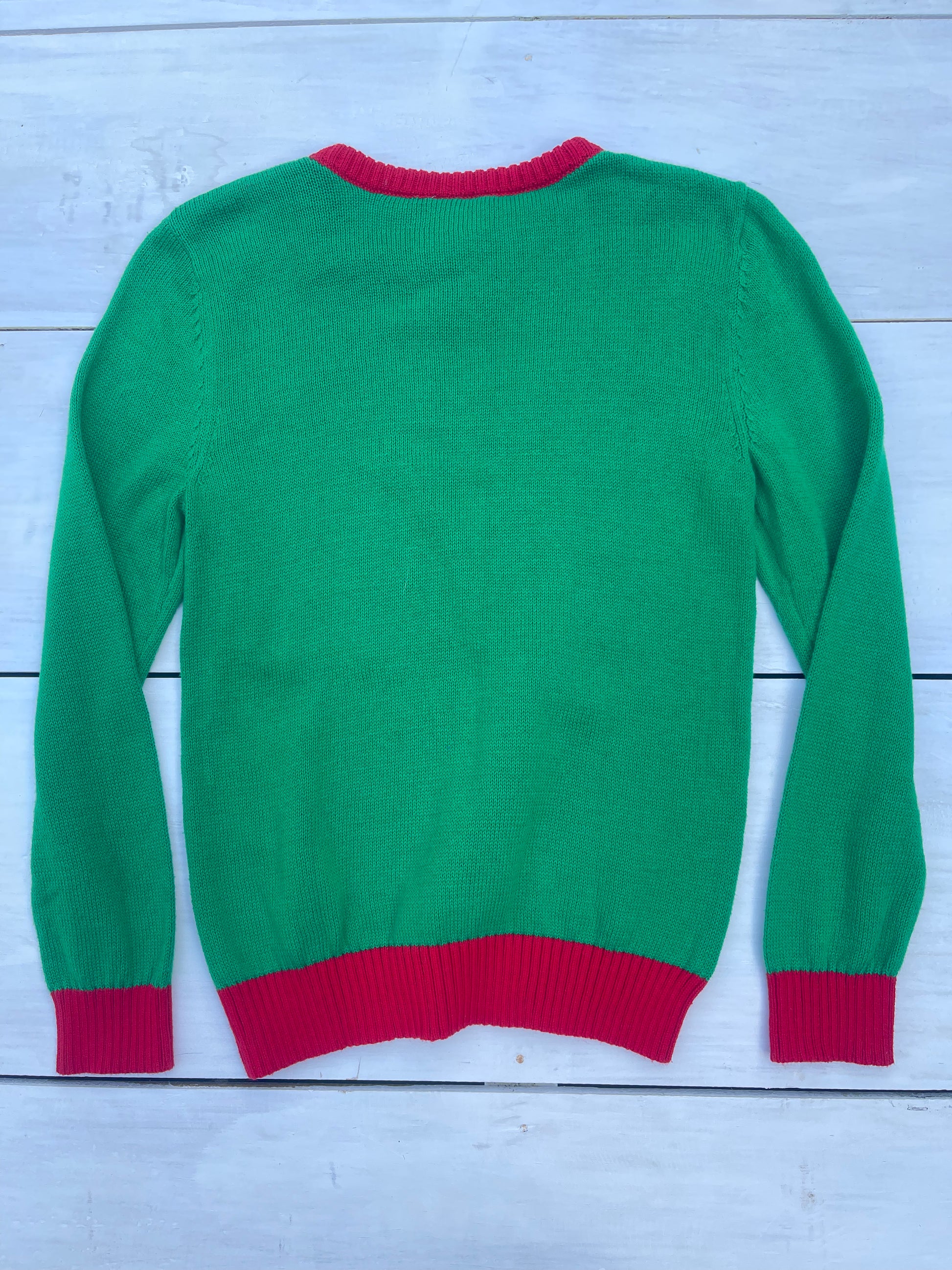 Verde, tejido, diseño navideño de Mickey, cuello y mangas rojas. Nuevo sin etiqueta.