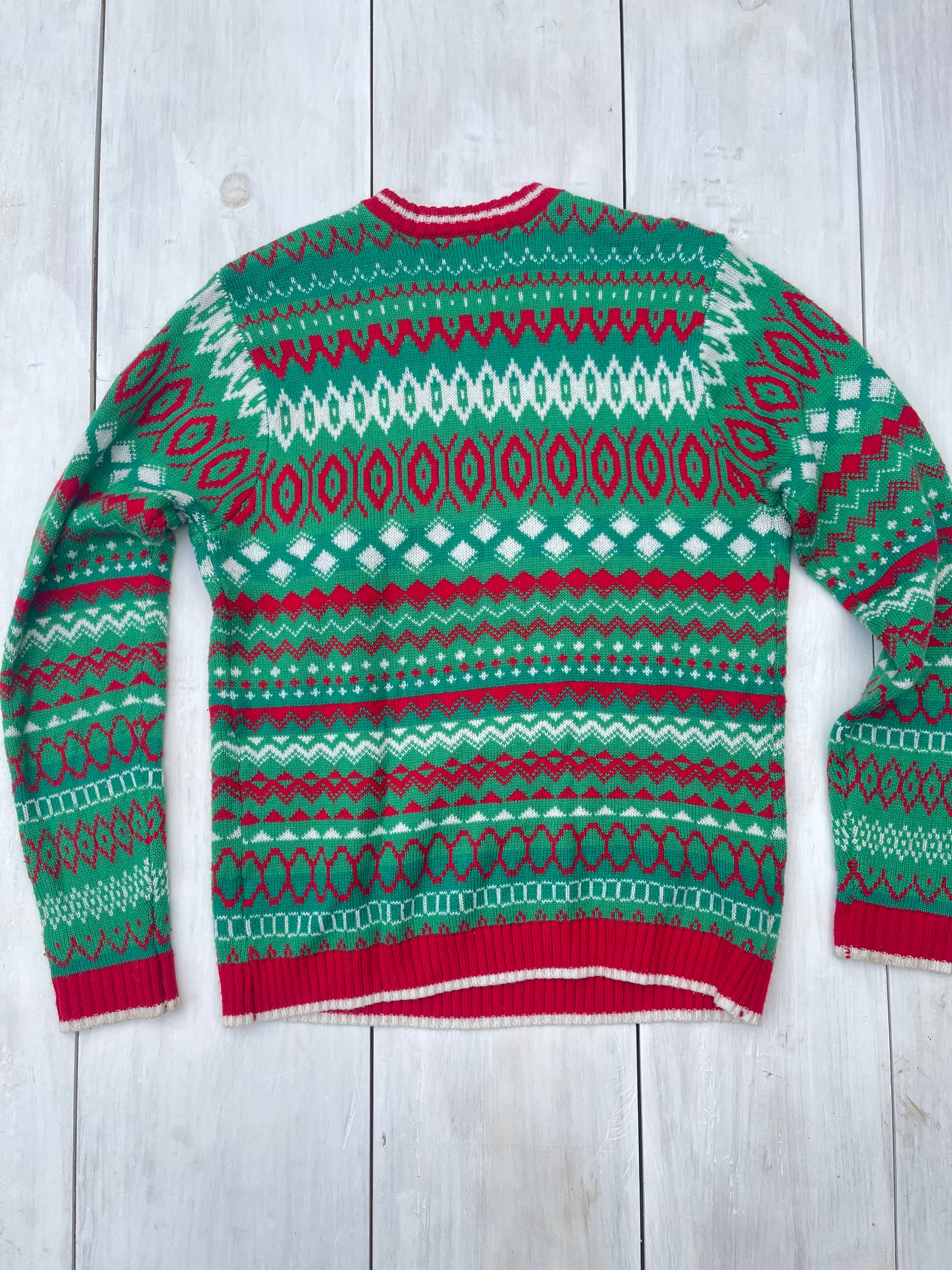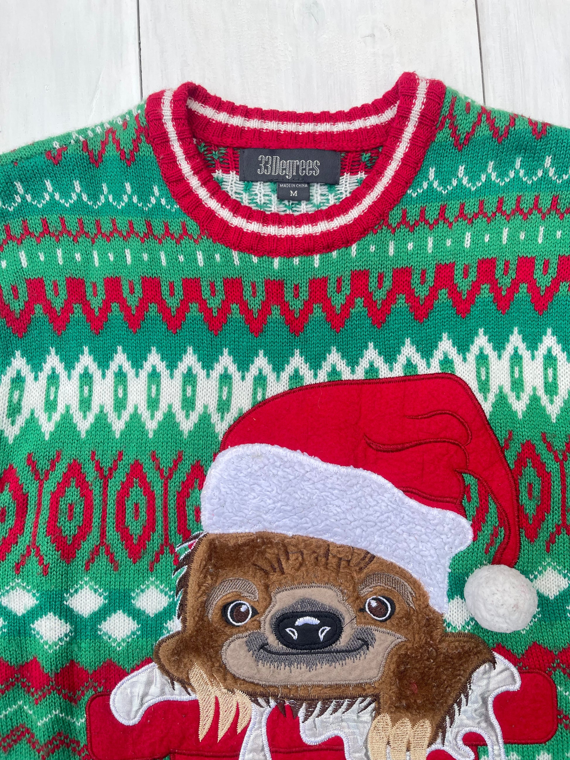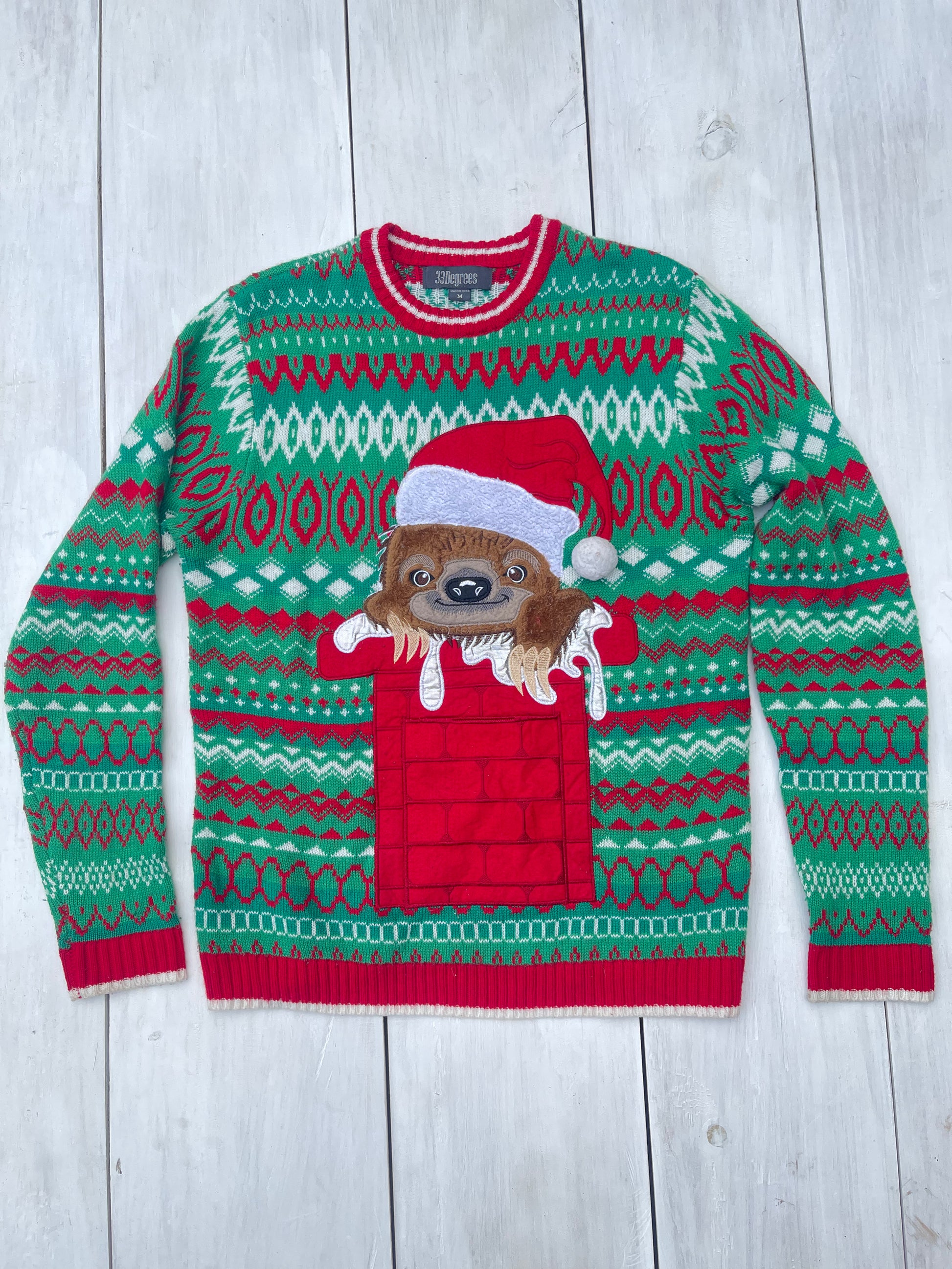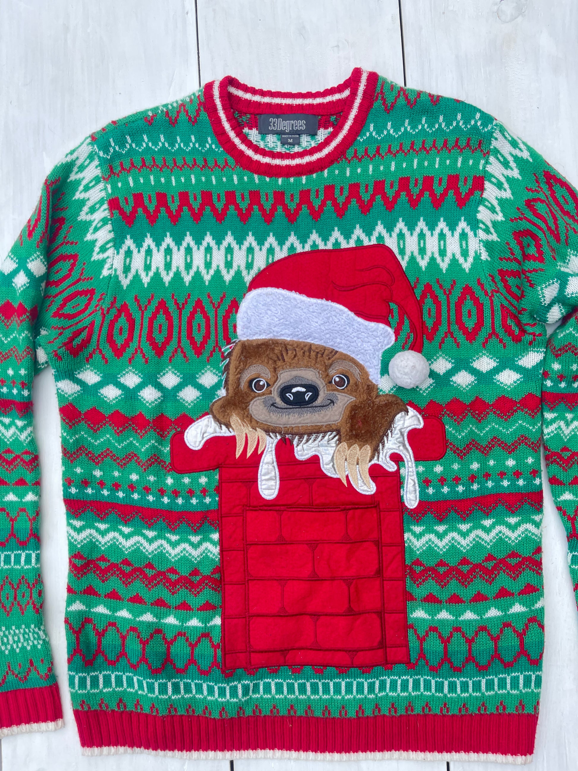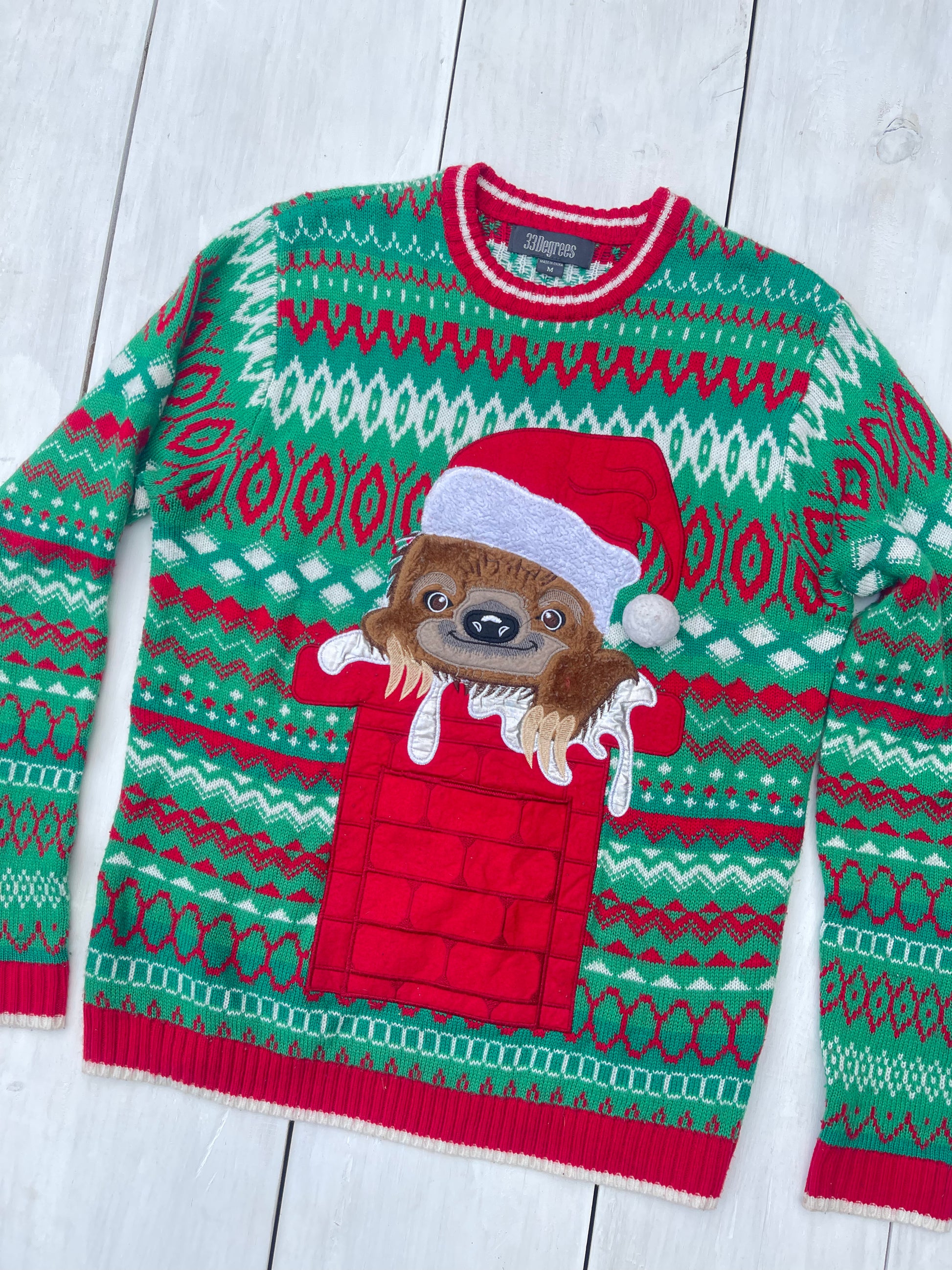 Verde con rojo y blanco, tejido muy calientito, con un perezoso saliendo de una chimenea navideña. Tiene bolsita al frente para una botella o el celular. unisex. De segunda mano en excelente estado.