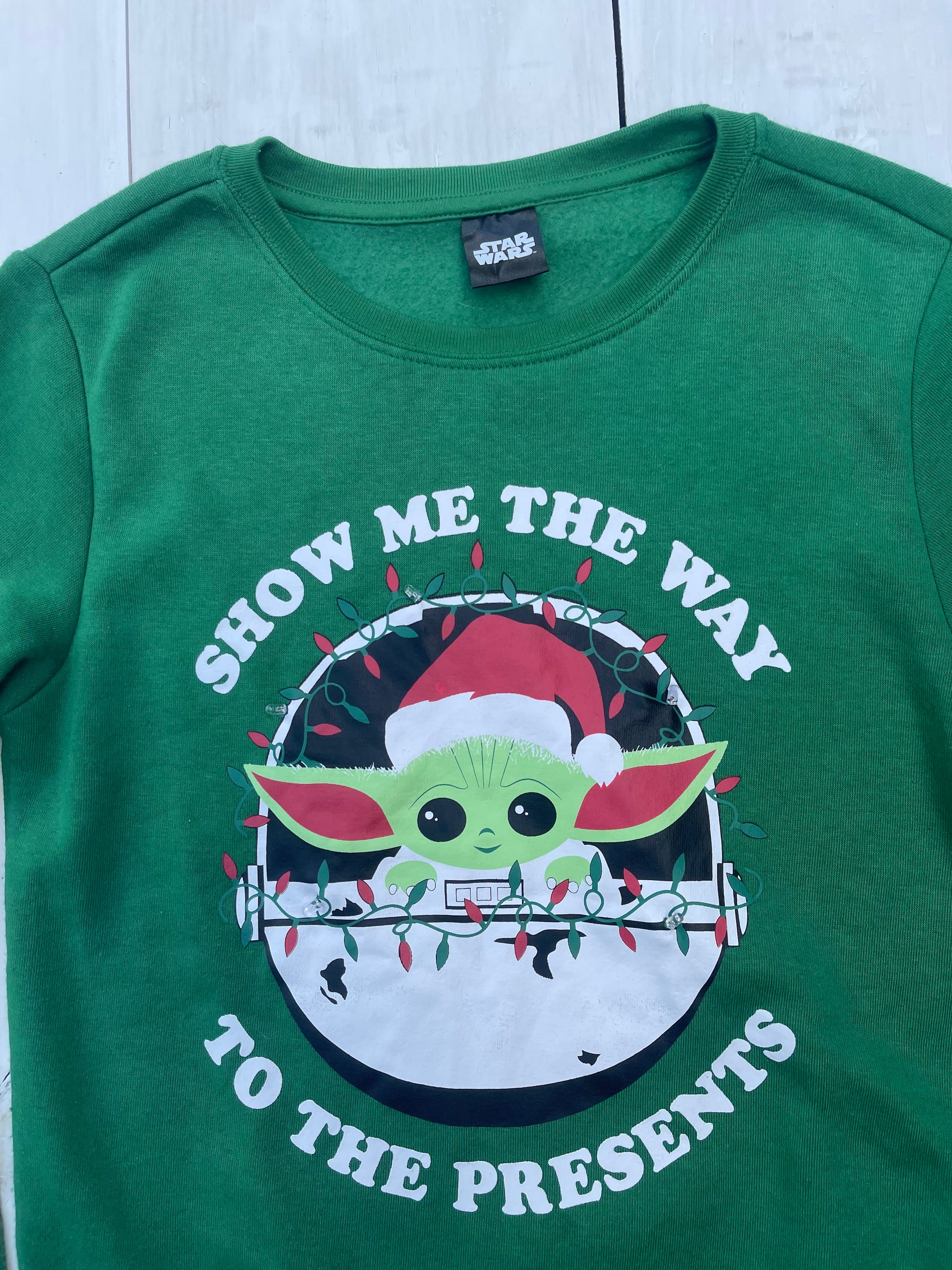 Verde, tela suave y calientita, diseño navideño de Baby Yoda con luces. Nuevo sin etiqueta.