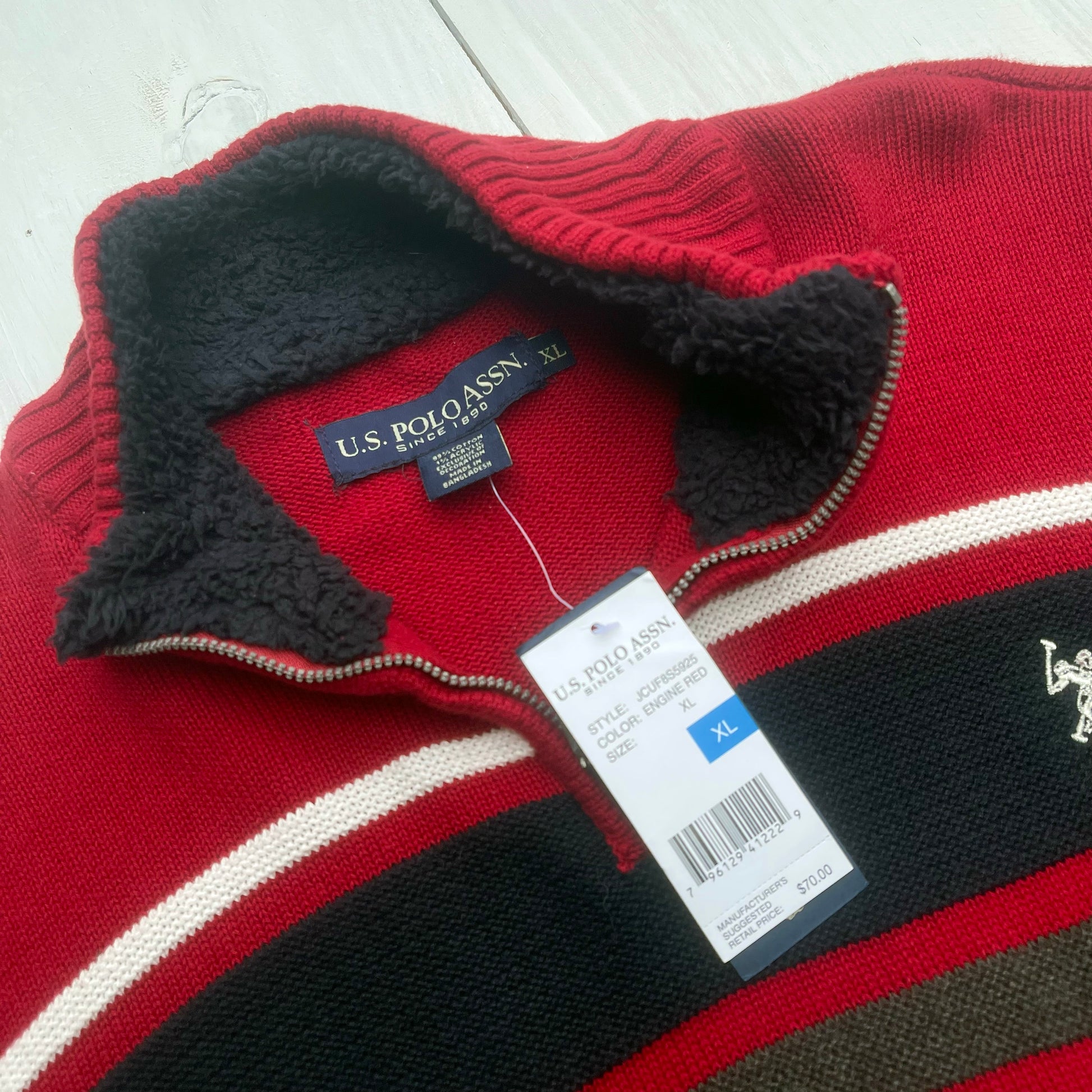 Corinto, azul, gris y blanco. Tejido calientito con diseño elegante y líneas al frente. Logo bordado al frente. Nuevo, con etiqueta.