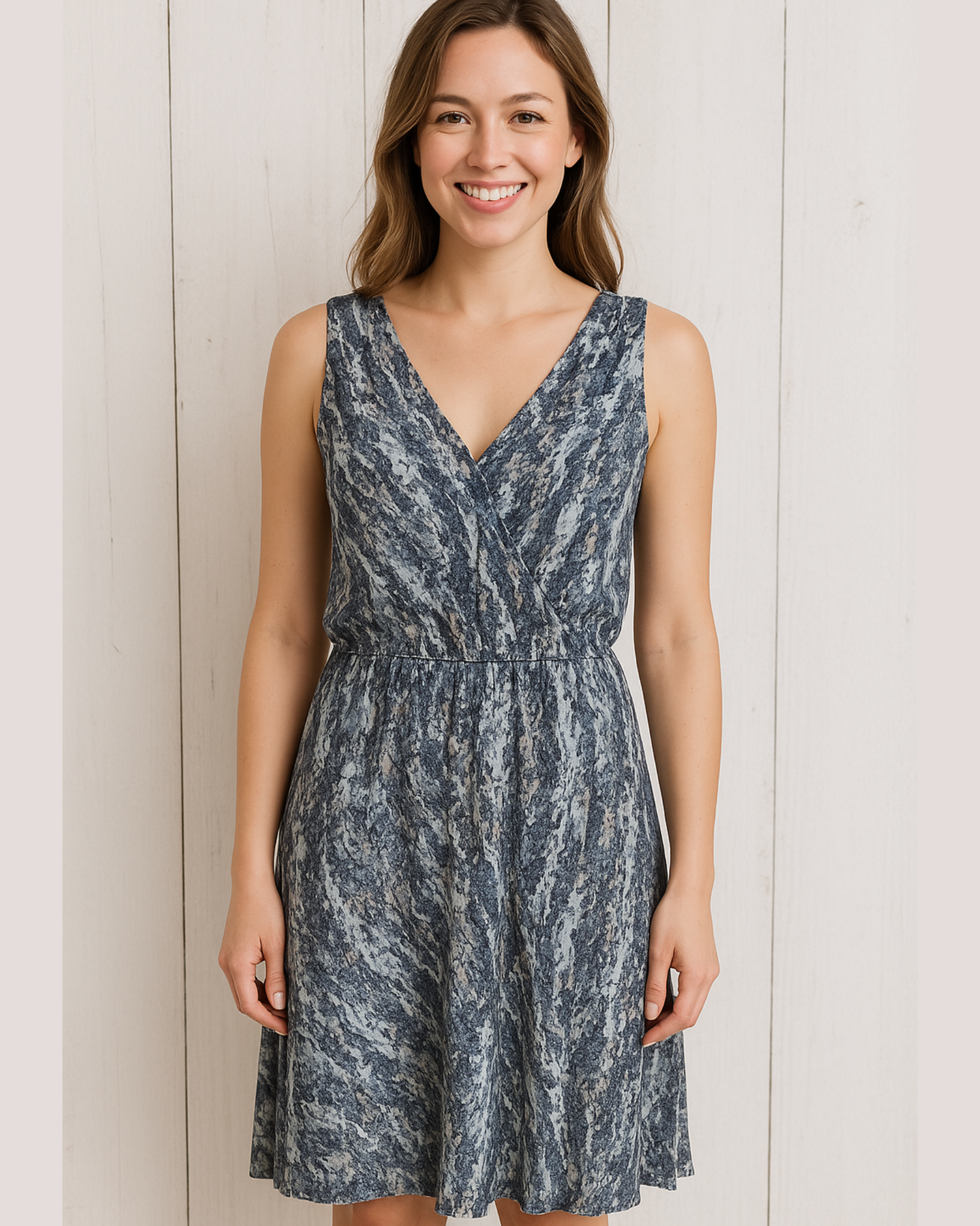 Tela suave, color azul, estampado, diseño elegante y casual.