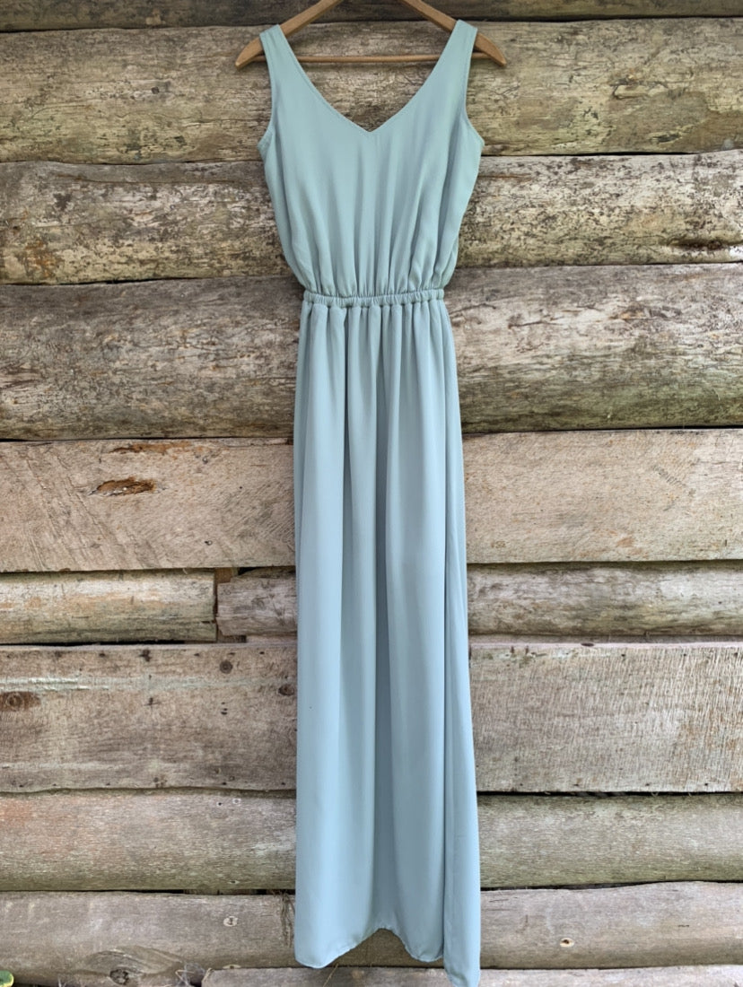 Tela suave y fresca, color celeste humo. Largo con elastico en la cintura.